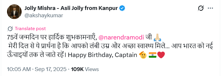 अक्षय ने एक्स पर लिखा- 75वें जन्मदिन पर हार्दिक शुभकामनाएं नरेंद्र मोदी जी। मेरी दिल से यह प्रार्थना है कि आपको लम्बी उम्र और अच्छा स्वास्थ्य मिले। आ भारत को नई उंचाइयों तक ले जाते रहें। हैप्पी बर्थडे, कैप्टन।