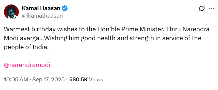 तमिल सिनेमा के सुपरस्टार कमल हासन ने एक्स पर पीएम मोदी को जन्मदिन की शुभकामनाएं दीं।