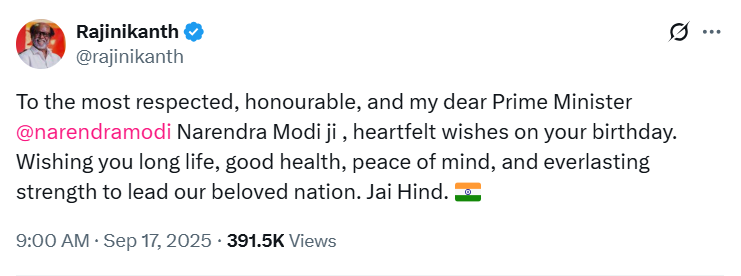 तमिल सुपरस्टार रजनीकांत ने एक्स पर लिखा- सबसे आदरणीय और सम्मानीय हमारे प्रिय प्रधान मंत्री नरेंद्र मोजी जी को जन्मदिन की हार्दिक शुभकामनाएं। आपको लम्बी उम्र, अच्छी सेहत, मानसिक शांति और अनंत शक्ति मिले। जय हिंद।