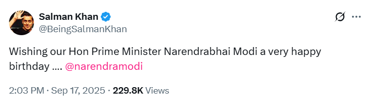 सलमान खान ने एक्स पर लिखा- हमारे आदरणीय प्रधानमंत्री नरेंद्रभाई मोदी को जन्मदिन की बहुत बधाई।