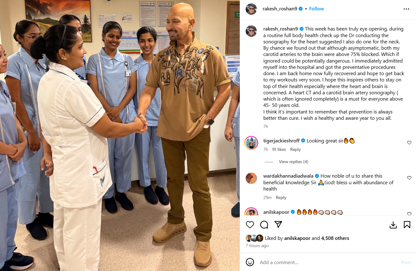 इस तस्वीर के साथ रोशन सीनियर ने लिखा- ”यह हफ्ता वाकई में आंखें खोलने वाला रहा। रुटीन फुल बॉडी चेकअप के दौरान दिल की सोनोग्राफी कर रहे डॉक्टर ने सलाह दी कि मैं गर्दन की भी करवा लूं। इत्तेफाक से, हमें पता चला कि मेरी दोनों कैरोटिड आर्टरी 75 फीसदी ब्लॉक हो गई हैं, जबकि मुझे इसके कोई लक्षण नहीं थे।”
