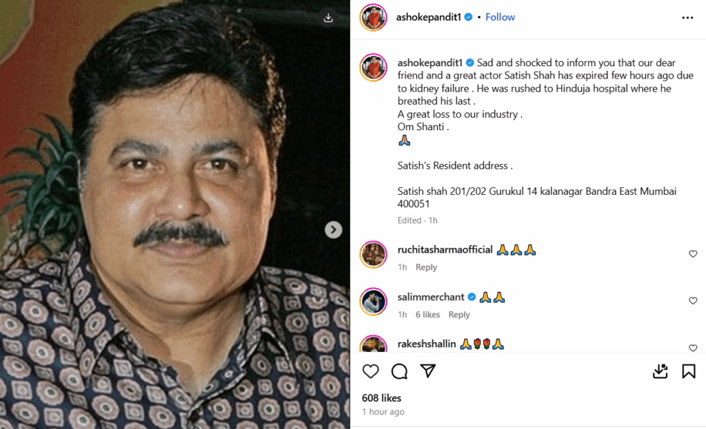 अशोक पंडित ने इंस्टाग्राम पर शाह के निधन की पुष्टि करते हुए लिखा, “यह बताता हुए बेहद दुखी और सदमे में हूं कि हमारे प्रिय मित्र और महान अभिनेता सतीश शाह का कुछ घंटे पहले किडनी फेलियर के कारण निधन हो गया।” उन्होंने बताया कि शाह घर पर अचानक बीमार पड़ गए थे, जिसके बाद उन्हें अस्पताल ले जाया गया।