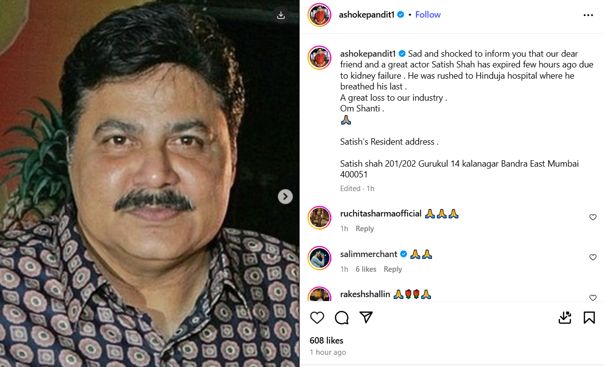 अशोक पंडित ने इंस्टाग्राम पर शाह के निधन की पुष्टि करते हुए लिखा, “यह बताता हुए बेहद दुखी और सदमे में हूं कि हमारे प्रिय मित्र और महान अभिनेता सतीश शाह का कुछ घंटे पहले किडनी फेलियर के कारण निधन हो गया।” उन्होंने बताया कि शाह घर पर अचानक बीमार पड़ गए थे, जिसके बाद उन्हें अस्पताल ले जाया गया।