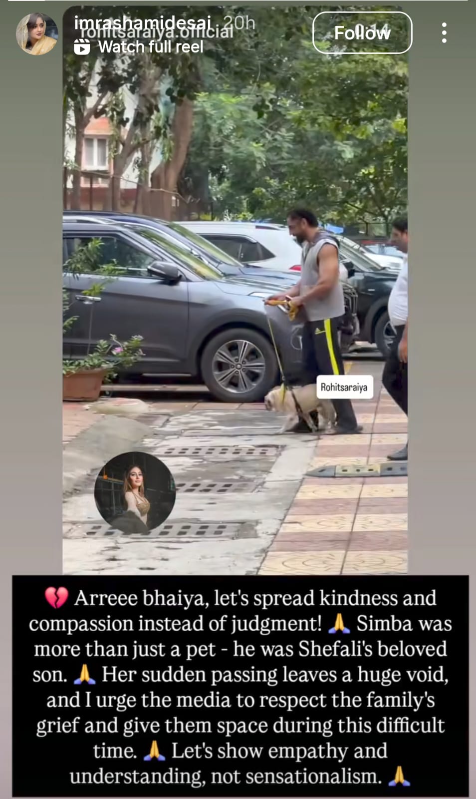 सिम्बा, एक पालतू जानवर से अधिक था- वो शेफाली के लिए बेटे की तरह था। मैं मीडिया से गुजारिश करती हूं कि परिवार के दुख का सम्मान करें और उन्हें अकेला छोड़ दें। कुछ तो सहानुभूति और समझदारी रखिए, सनसनी मत फैलाइए।