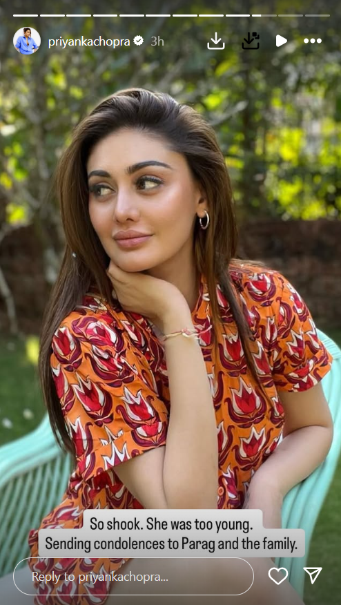 प्रियंका चोपड़ा ने रविवार को शेफाली के निधन पर अफसोस जाहिर किया। उन्होंने एक्ट्रेस की फोटो इंस्टाग्राम स्टोरी में लगाकर लिखा- हिल गई हूं। अभी तो वो यंग थीं। पराग और परिवार के प्रति मेरी संवेदनाएं।