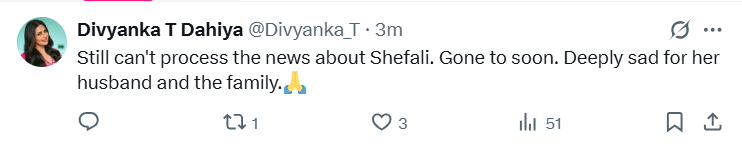 टीवी एक्ट्रेस दिव्यांका त्रिपाठी ने एक्स पर लिखा- शेफाली के बारे में जो खबर आई है, उसको जज्ब नहीं कर पा रही हूं। बहुत जल्दी चली गईं। उनके पति और परिवार के लिए बेहद दुखी हूं।