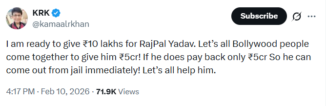 केआरके ने अगली पोस्ट में लिखा- मैं राजपाल यादव को 10 लाख रुपये देने के लिए तैयार हूं। आइए, बॉलीवुड के सभी लोग मिलकर उन्हें 5 करोड़ रुपये देते हैं। अगर, वो (राजपाल) 5 करोड़ रुपये लौटा देते हैं तो फौरन जेल से बाहर आ सकते हैं। आइए, उनकी मदद करें।