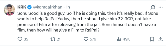 यू-ट्यूबर और फिल्ममेकर कमाल राशिद खान यानी केआरके ने भी राजपाल यादव की आर्थिक मदद की घोषणा की, मगर सोनू सूद पर तंज कसना नहीं भूले। केआरके ने एक्स पर लिखा- सोनू सूद अच्छे इंसान हैं।