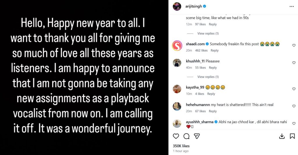 मंगलवार की शाम अरिजीत ने इंस्टाग्राम पर पोस्ट शेयर की, जिसमें लिखा- हैलो, सभी को नये साल की बधाई। आप सब श्रोताओं ने इतने सालों तक मुझे जो प्यार दिया, उसके लिए मैं आपका शुक्रिया अदा करना चाहता हूं।