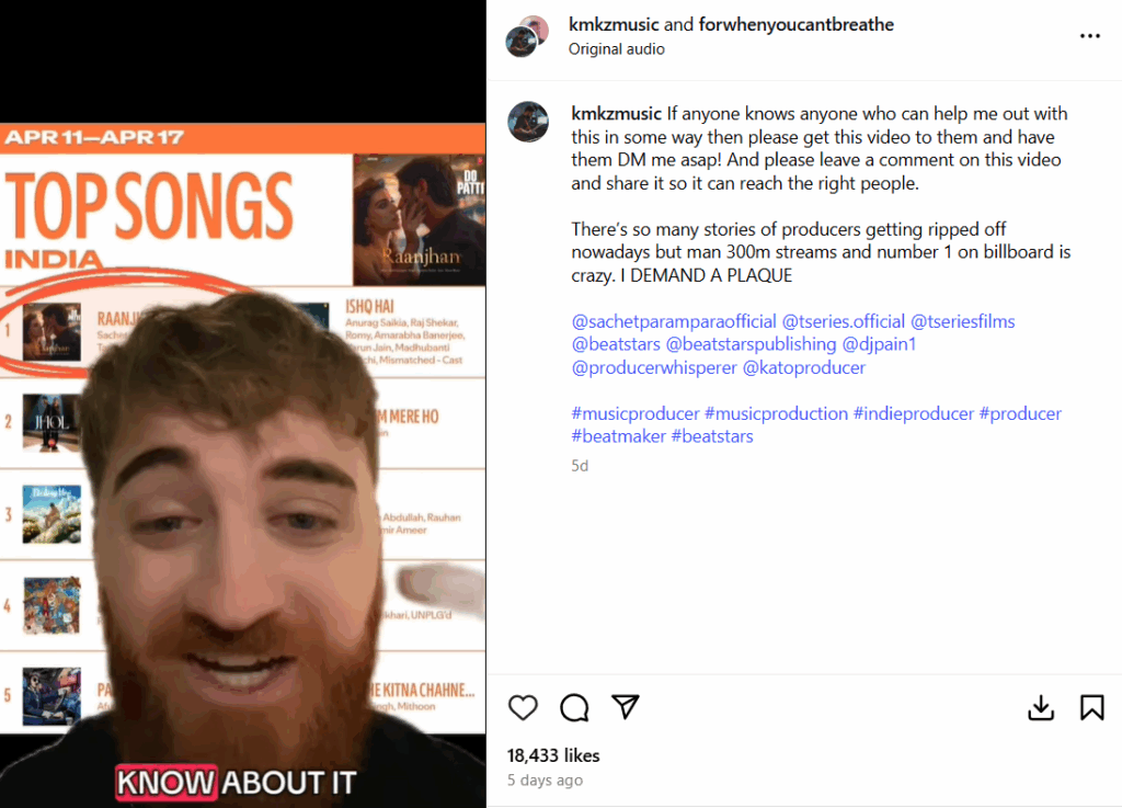 KMKZ ने एक और वीडियो में यह भी खुलासा किया कि म्यूजिक लाइसेंसिंग कंपनी BeatStars Publishing इस मामले में उनकी मदद कर रही है। उन्होंने ‘रांझण’ और अपनी मूल बीट की तुलना करते हुए दिखाया कि दोनों में पियानो का इस्तेमाल और धुन काफी समान है।