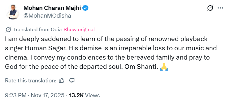 ह्यूमेन सागर की मौत उड़िया संगीत के लिए बड़ा झटका है। उनकी मधुर आवाज और भावपूर्ण गायकी ने लाखों दिलों को छुआ। मुख्यमंत्री मोहन चरण मजही ने एक्स पर अफसोज जाहिर करते हुए लिखा- विख्यात प्लेबैक सिंगर ह्यूमेन सागर के निधन की खबर सुनकर मैं अत्यंत दुखी हूं।