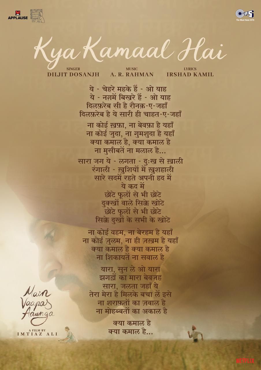 मुंबई। Kya Kamaal Hai Song Out: इम्तियाज अली की फिल्म मैं वापस आऊंगा का पहला गाना क्या कमाल है शनिवार को रिलीज कर दिया गया। दिलजीत दोसांझ की आवाज को ए. आर. रहमान ने सुरों में पिरोया है, जबकि गाने के बोल इरशाद कामिल ने लिखे हैं। इस गाने के लिए पहली बार रहमान और दिलजीत साथ आये हैं। गाना मुश्किल वक्त में भी उम्मीद की किरण दिखाता है।