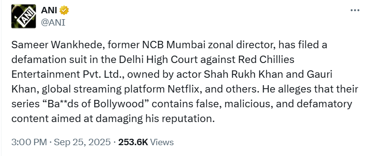 मुंबई। The Bads Of Bollywod: पूर्व नारकोटिक्स कंट्रोल ब्यूरो (एनसीबी) अधिकारी समीर वानखेड़े ने बॉलीवुड सुपरस्टार शाह रुख खान की प्रोडक्शन कंपनी रेड चिलीज एंटरटेनमेंट, उनके बेटे आर्यन खान की डेब्यू वेब सीरीज ‘द बैड्स ऑफ बॉलीवुड’ और स्ट्रीमिंग प्लेटफॉर्म नेटफ्लिक्स के खिलाफ दिल्ली हाई कोर्ट में गुरुवार को मानहानि का मुकदमा दायर किया है।