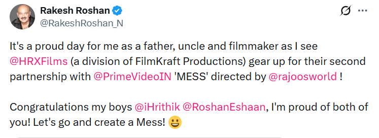 उन्होंने लिखा- एक पिता, अंकल और फिल्ममेकर के तौर पर मेरे लिए यह गर्व की बात है कि फिल्मक्राफ्ट प्रोडक्शंस की डिवीजन एचआरएक्स फिल्म्स प्राइम वीडियो के साथ अपनी दूसरी पार्टनरशिप कर रही है। राकेश ने ऋतिक और एहसान को इसके लिए बधाई दी।