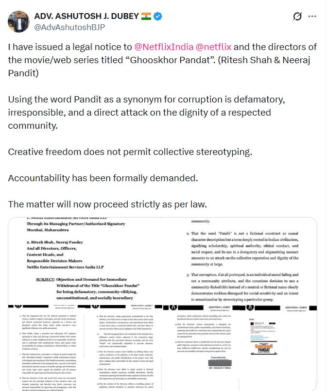 इस नोटिस में नेटफ्लिक्स के अधिकारियों के साथ लेखक-निर्देशक रितेश शाह और नीरज पांडेय को पार्टी बनाया गया है। याचिका में गया है कि पंडित को भ्रष्टाचार का पर्यायवाची बताना अपमानजनक है और पूरे समुदाय की गरिमा पर हमला है। क्रिएटिव फ्रीडम का मतलब यह नहीं कि सामूहिक रूप से स्टीरियो-टाइप कर दिया जाए।