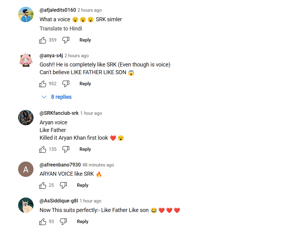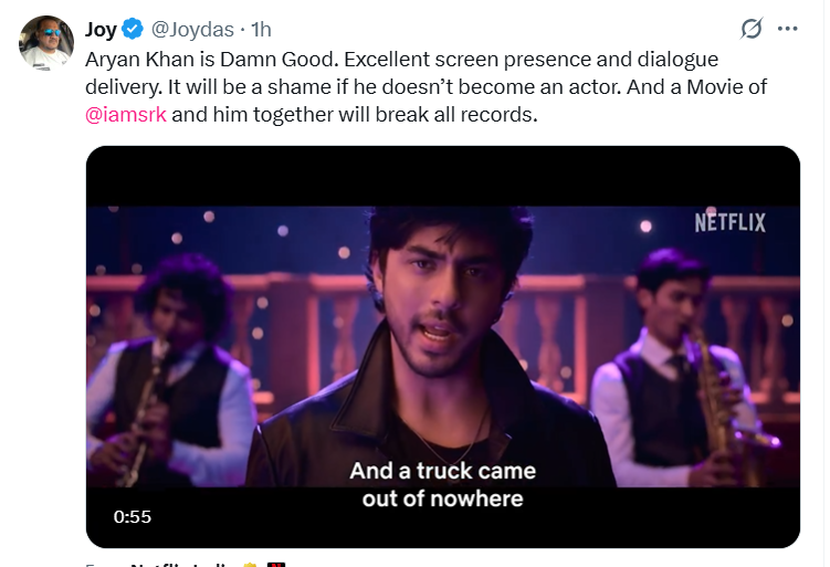 आर्यन को लेकर फैंस काफी उत्साहित हैं और उनमें शाह रुख की झलक दख रहे हैं। खासकर, आर्यन की आवाज और डायलॉग डिलीवरी ने समां बंधा दिया है। कई यूजर्स ने उनकी तारीफ भी की है।