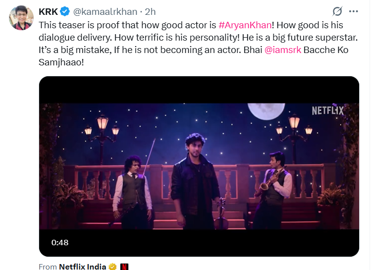 यू-ट्यूबर और एक्टर केआरके ने यहां तक कह दिया कि आर्यन भविष्य के सुपरस्टार हैं। शाह रुख को समझाना चाहिए कि वो पर्दे पर आकर अभिनय करें।