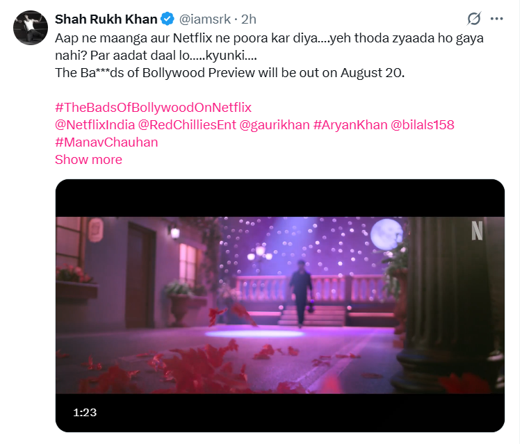 शाह रुख ने टीजर शेयर करके लिखा- आपने मांग और नेटफ्लिक्स ने पूरा कर लिया। यह थोड़ा ज्यादा हो गया नही? पर आदत डाल लो, क्योंकि द बैड्स ऑफ बॉलीवुड का प्रीव्यू 20 अगस्त को आएगा।