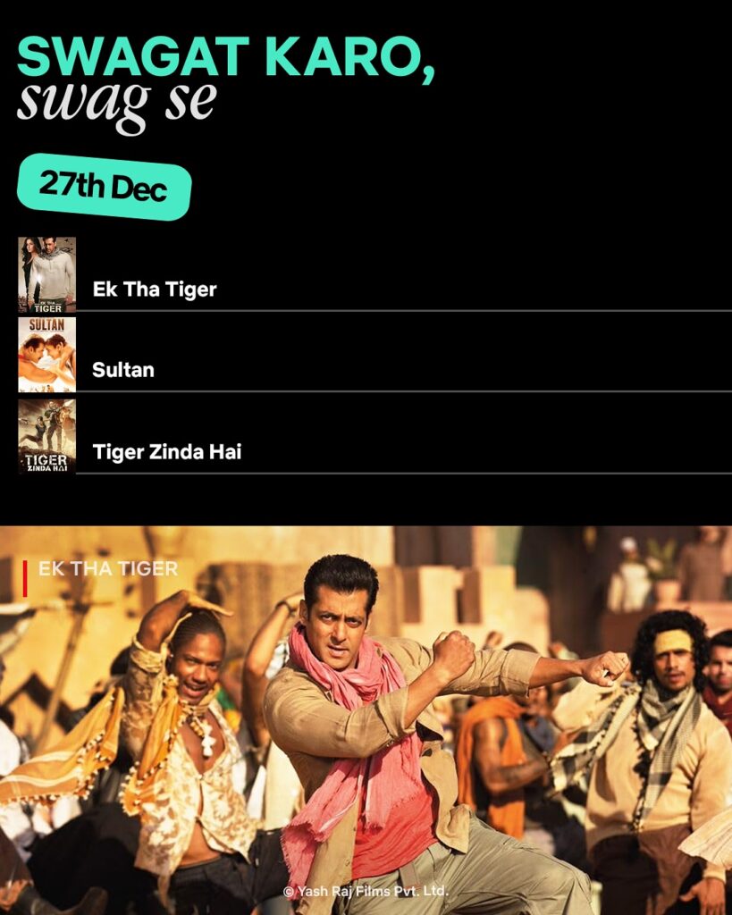 - अगले महीने सलमान खान के साठवें जन्मदिन पर उनकी तीन ब्लॉकबस्टर फिल्में- एक था टाइगर, सुल्तान और टाइगर जिंदा है- 27 दिसंबर को स्ट्रीम होंगी। टाइगर 3 अभी भी प्राइम वीडियो पर मौजूद है।