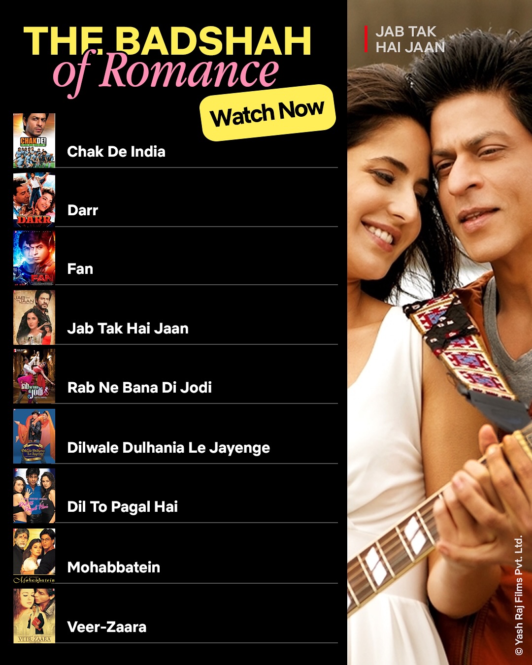 - इसकी शुरुआत शाह रुख खान के जन्मदिन से हो रही है। बॉलीवुड के बादशाह इस साल अपना 60वां बर्थडे मना रहे हैं और इस सेलिब्रेशन को ज्वाइन करते हुए नेटफ्लिक्स ने शाह रुख की नौ यादगार फिल्में एक नवम्बर से प्लेटफॉर्म पर उतार दी हैं। इनमें दिलवाले दुल्हनिया ले जाएंगे, मोहब्बतें, दिल तो पागल है, वीर-जारा और चक दे इंडिया शामिल हैं।