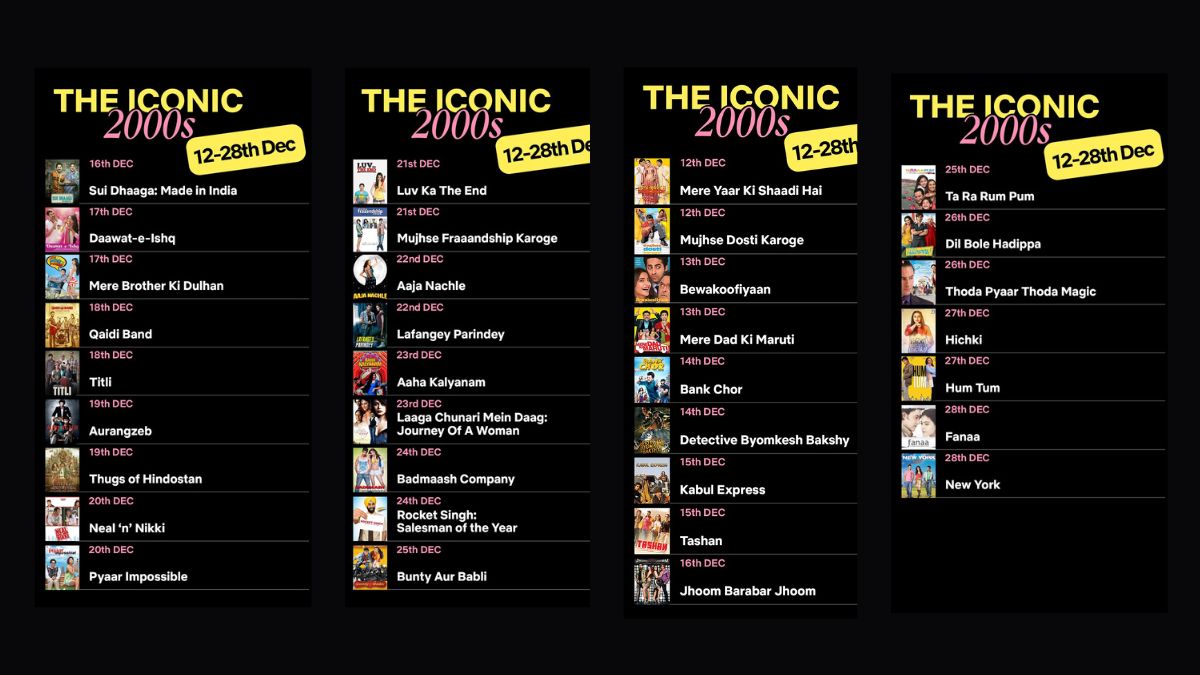 - फेस्टिव मूड और विंटर वेकेशन एंजॉय करने के लिए 34 फिल्में 12 से 28 दिसम्बर के बीच प्लेटफॉर्म पर हर रोज 2 फिल्में आएंगी। इनमें बंटी और बबली, हम तुम, थोड़ा प्यार थोड़ा मैजिक, मुझसे दोस्ती करोगे और ता रा रम पम शामिल हैं।