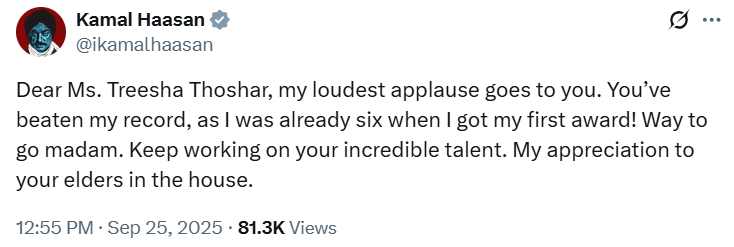 यही वजह है कि दिग्गज तमिल अभिनेता कमल हासन भी इस नन्ही कलाकार की असाधारण प्रतिभा से प्रभावित हैं, जिसका अंदाजा कमल हासन की पोस्ट से होता है। गुरुवार को कमल ने एक्स पर त्रिशा को बधाई देते हुए पोस्ट लिखी, जिसमें उन्होंने कहा-