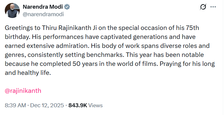 पीएम मोदी ने अपने एक्स एकाउंट पर रजनीकांत को बधाई देते हुए लिखा- थीरू रजनीकांत जी के लिए 75वें जन्मदिन के खास अवसर पर शुभकामनाएं। उनके परफॉर्मेंसेज ने कई पीढ़ियों को प्रभावित किया और बड़े पैमाने पर प्रशांस मिली। उनका काम विभिन्न तरह के किरदारों और जॉनर्स में नजर आता है, जिसके जरिए उन्हें निरंतर बेंचमार्च स्थापित किये हैं।
