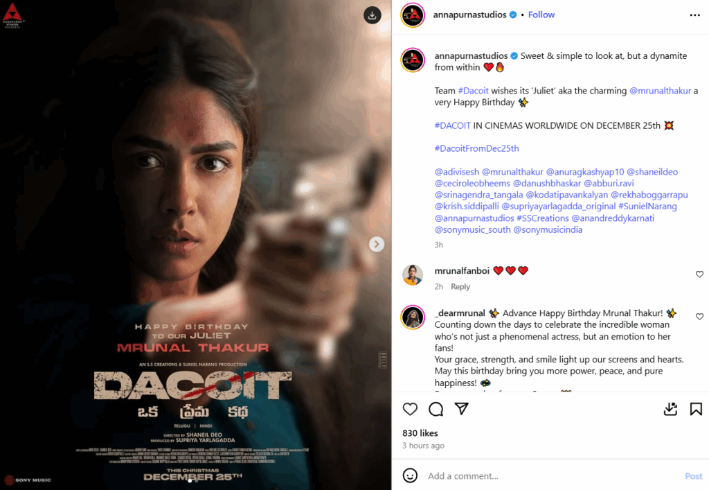 सोशल मीडिया में पोस्टर के साथ लिखा गया- “देखने में मासूम और सादगी भरी, लेकिन अंदर से डायनामाइट टीम डकैत अपनी ‘जूलियट’ यानी आकर्षक मृणाल को जन्मदिन की हार्दिक शुभकामनाएं देती है।”