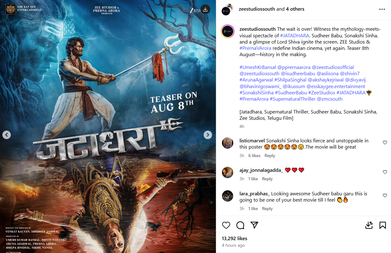 जटाधरा का निर्देशन वेंकट कल्याण ने किया है, जबकि निर्माण जी स्टूडियोज और प्रेरणा अरोड़ा ने किया है। इसके साथ सूचना दी गई है कि टीजर 8 अगस्त को आएगा।