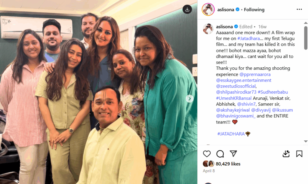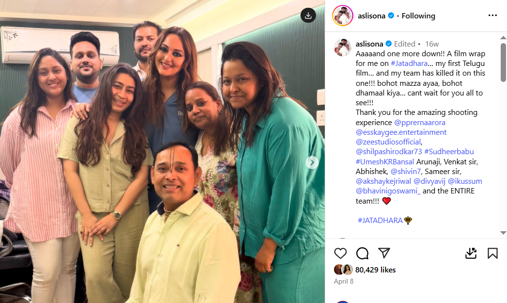 सोनाक्षी ने लिखा था- एक और फिल्म हो गई। मेरी पहली तेलुगु फिल्म जटाधरा की शूटिंग मैंने पूरी कर ली है। मेरी टीम ने जबरदस्त काम किया है। बहुत मजा आया, बहुत धमाल किया। अब आपके देखने का इंतजार है। फिल्म में शिल्पा शिरोडकर भी अहम किरदार में दिखेंगी।