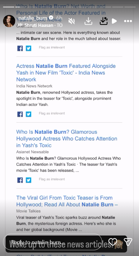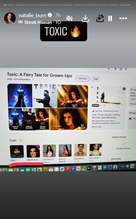 यश के साथ कार वाले सीन में नैटली ही हैं, इसकी पुष्टि करने के लिए हमने उनका वैरीफाइड इंस्टाग्राम एकाउंट चेक किया। नैटली ने टॉक्सिक को लेकर कोई पोस्ट तो नहीं लिखी है। अलबत्ता, अपनी इंस्टाग्राम स्टोरी में टॉक्सिक की स्टार कास्ट को शेयर किया है, जिसमें वो खुद भी नजर आ रही हैं, जिससे इस बात की तस्दीक होती है कि नैटली टॉक्सिक का हिस्सा हैं।