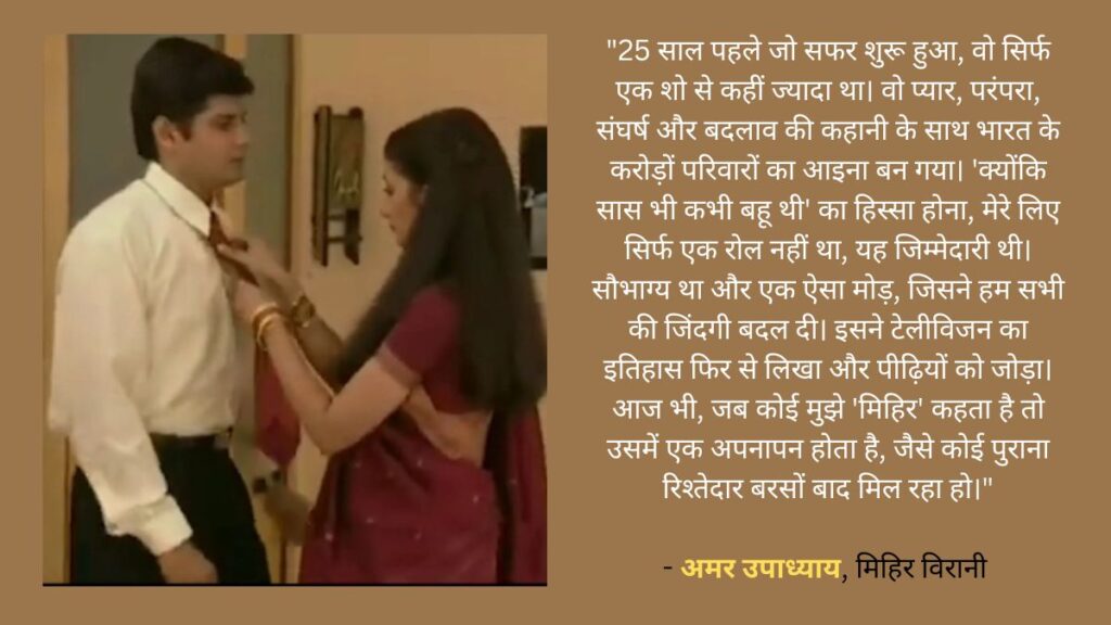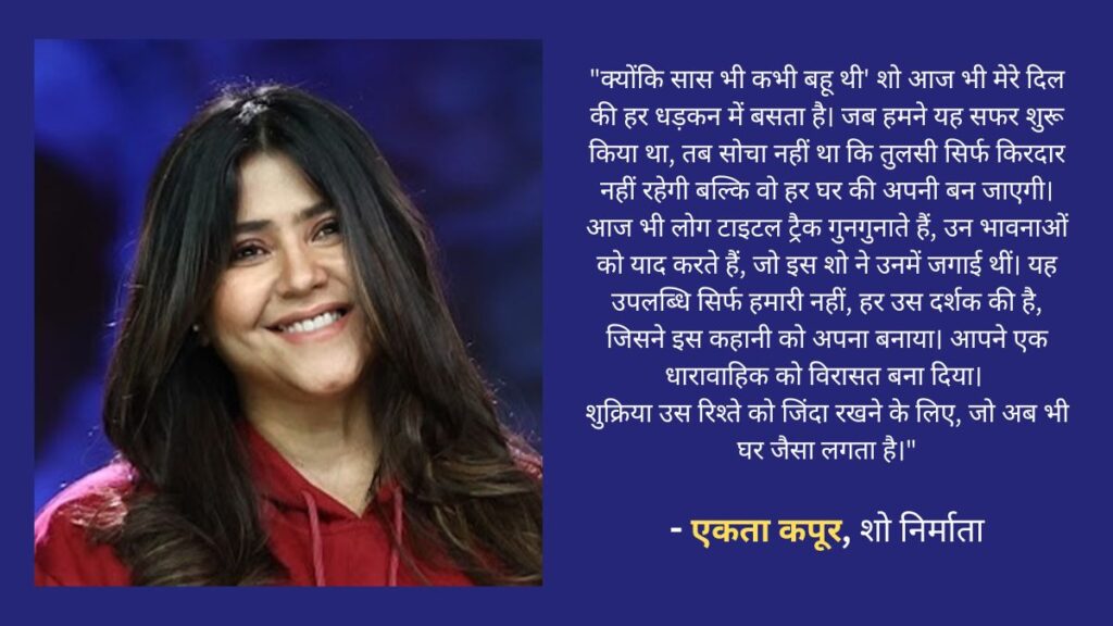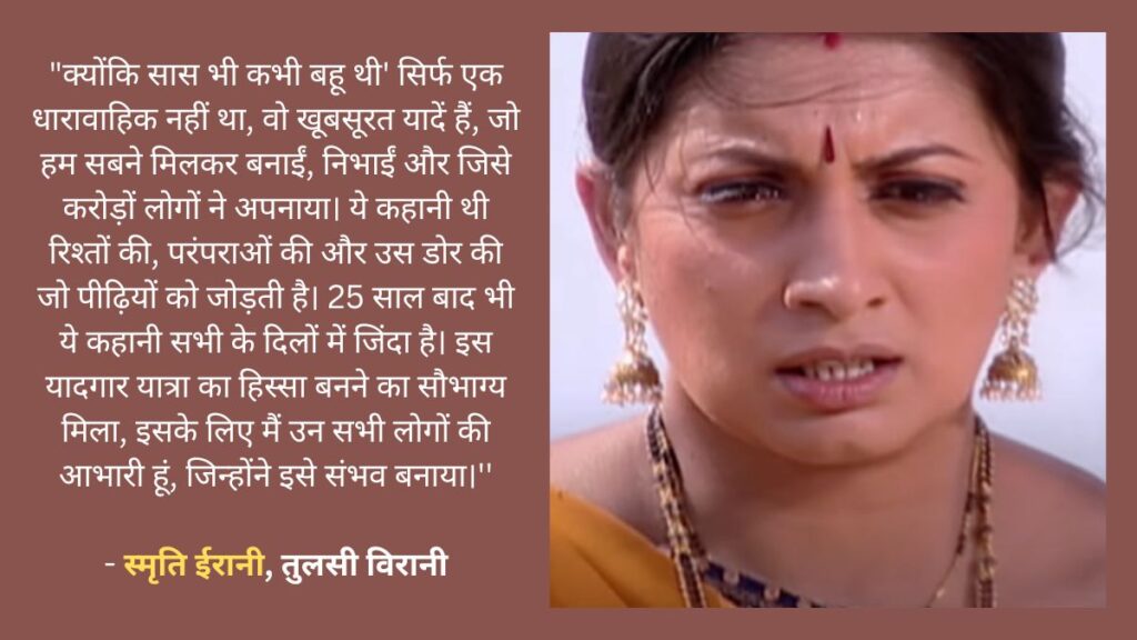 मुंबई में बसी गुजराती विरानी फैमिली की कहानी अपने किरदारों के प्रस्तुतिकरण को लेकर बहस के दायरे में आया तो कभी कलाकारों की आवाजाही को लेकर खबरों में रहा। शो को कुछ दृश्यों के कारण कानूनी लड़ाई भी लड़नी पड़ी। क्यूंकि सास भी कभी बहू थी के 25वें पड़ाव (25 Years Of Kyunki Saas Bhi Kabhi Bahu Thi) पर इससे जुड़ी कुछ खास बातें और यादें।