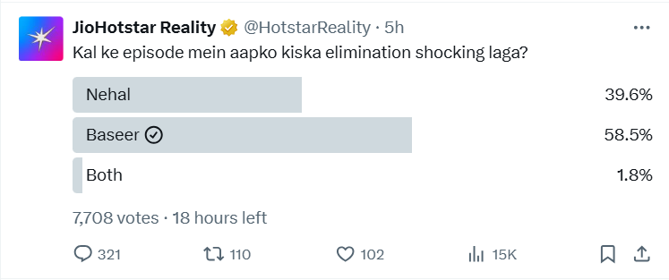 खबर लिखे जाने तक इस हैशटैग पर 1 लाख से ज्यादा पोस्ट लिखी जा चुकी हैं। वहीं, जिओ हॉटस्टार रिएलिटी के एक्स एकाउंट पर एक पोल भी करवाया गया, जिसमें पूछा गया था कि किसका एलिमिनेशन सबसे ज्यादा शॉकिंग लगा?