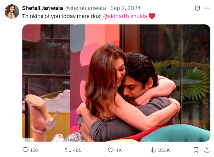 एक्स पर शेफाली की आखिरी पोस्ट सिद्धार्थ शुक्ला के नाम