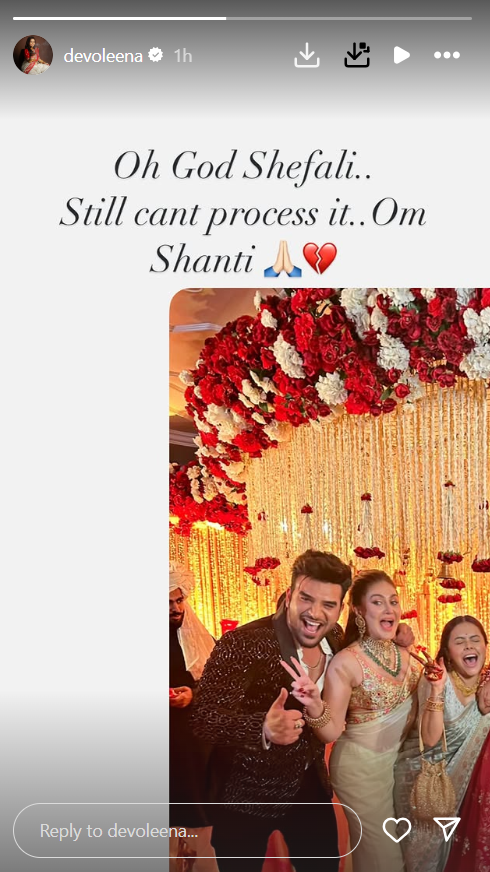 देवोलीना भट्टाचार्जी ने शेफाली के साथ किसी फंक्शन की तस्वीर साझा की, जिसमें पारस छाबड़ा भी हैं। सभी फोटो के लिए खिलखिलाते हुए रिएक्शन दे रहे हैं। इसके साथ उन्होंने लिखा- हे ईश्वर, शेफाली। अभी भी यकीन नहीं हो रहा। ओम शांति।