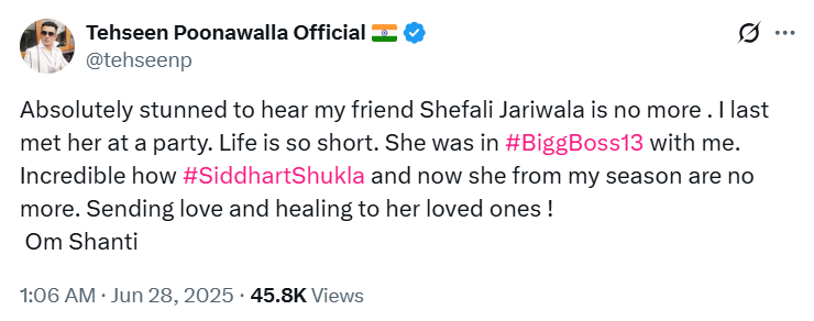पॉलिटिशियन और सोशलाइट तहसीन पूनावाला ने शुक्रवार रात को एक्स पर लिखा- मेरी दोस्त शेफाली जरीवाला नहीं रहीं, यह सुनकर हैरान हूं। मैं उनसे आखिरी बार एक पार्टी में मिला था। जीवन कितना छोटा है। वो बिग बॉस 13 में मेरे साथ थीं। कितना आश्चर्यजनक है कि मेरे सीजन से पहले सिद्धार्थ शुक्ला और अब वो नहीं रहीं। उनके चाहने वालों को अपना प्यार भेज रहा हूं। ओम शांति।