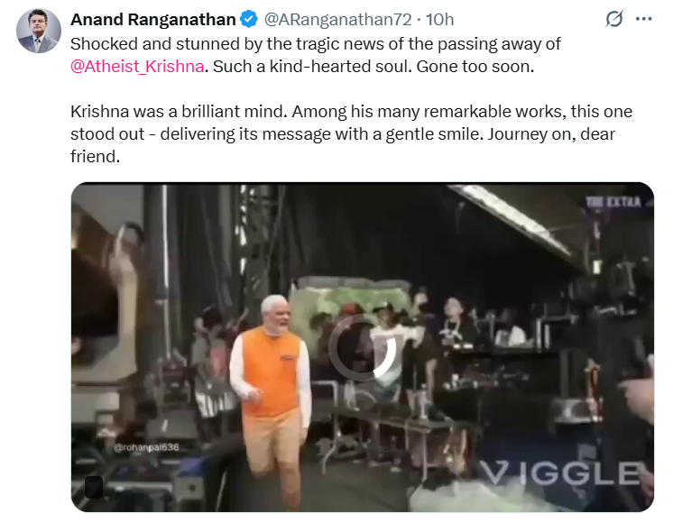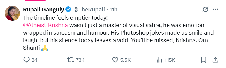 “टाइमलाइन आज सूनी लग रही है! @Atheist_Krishna केवल व्यंग्य के मास्टर नहीं थे, वे भावनाओं को हास्य और व्यंग्य में पिरोने वाले कलाकार थे। उनके फोटोशॉप जोक्स हमें हंसाते थे, लेकिन उनकी चुप्पी ने आज एक खालीपन छोड़ दिया। तुम्हें याद किया जाएगा, कृष्णा। ओम शांति।”